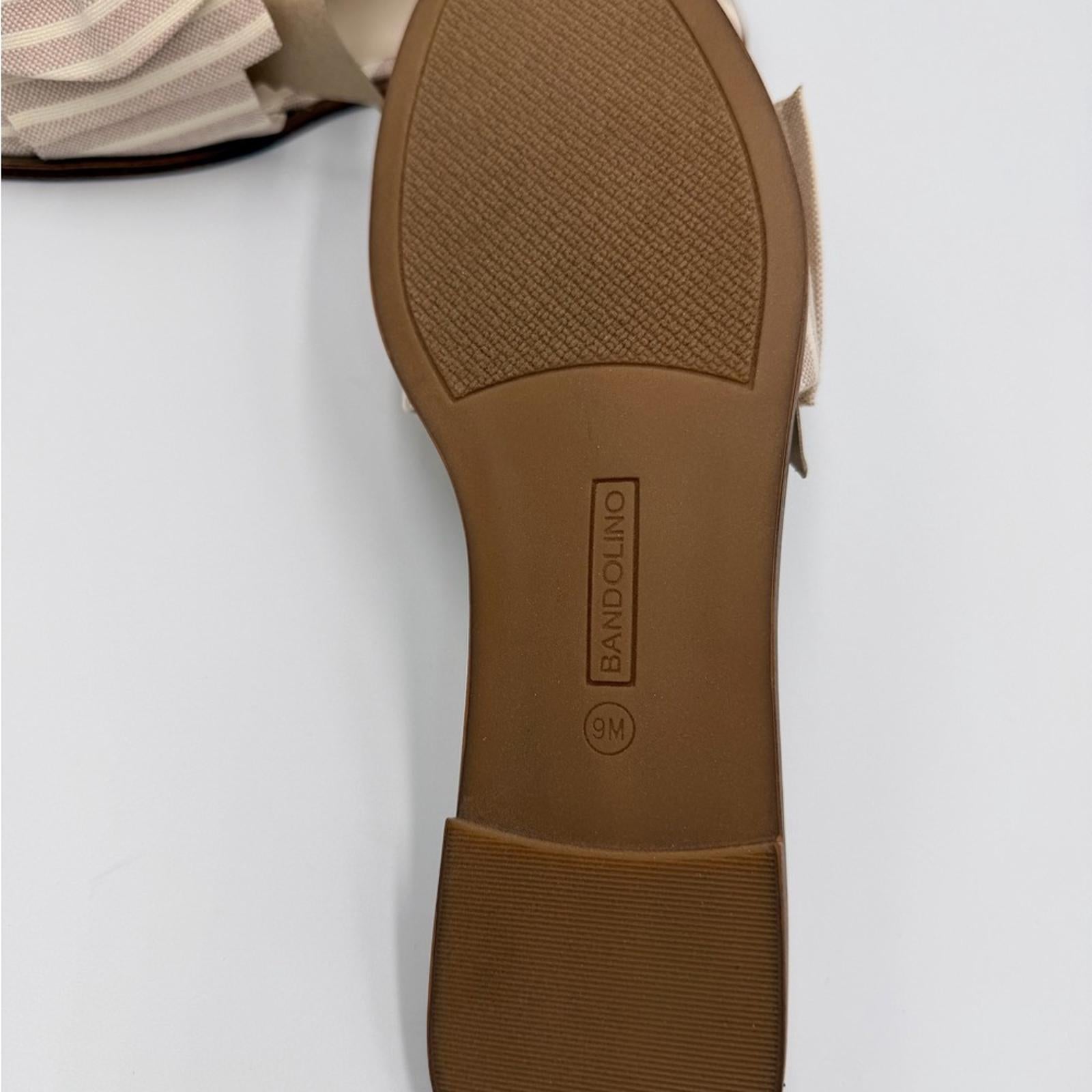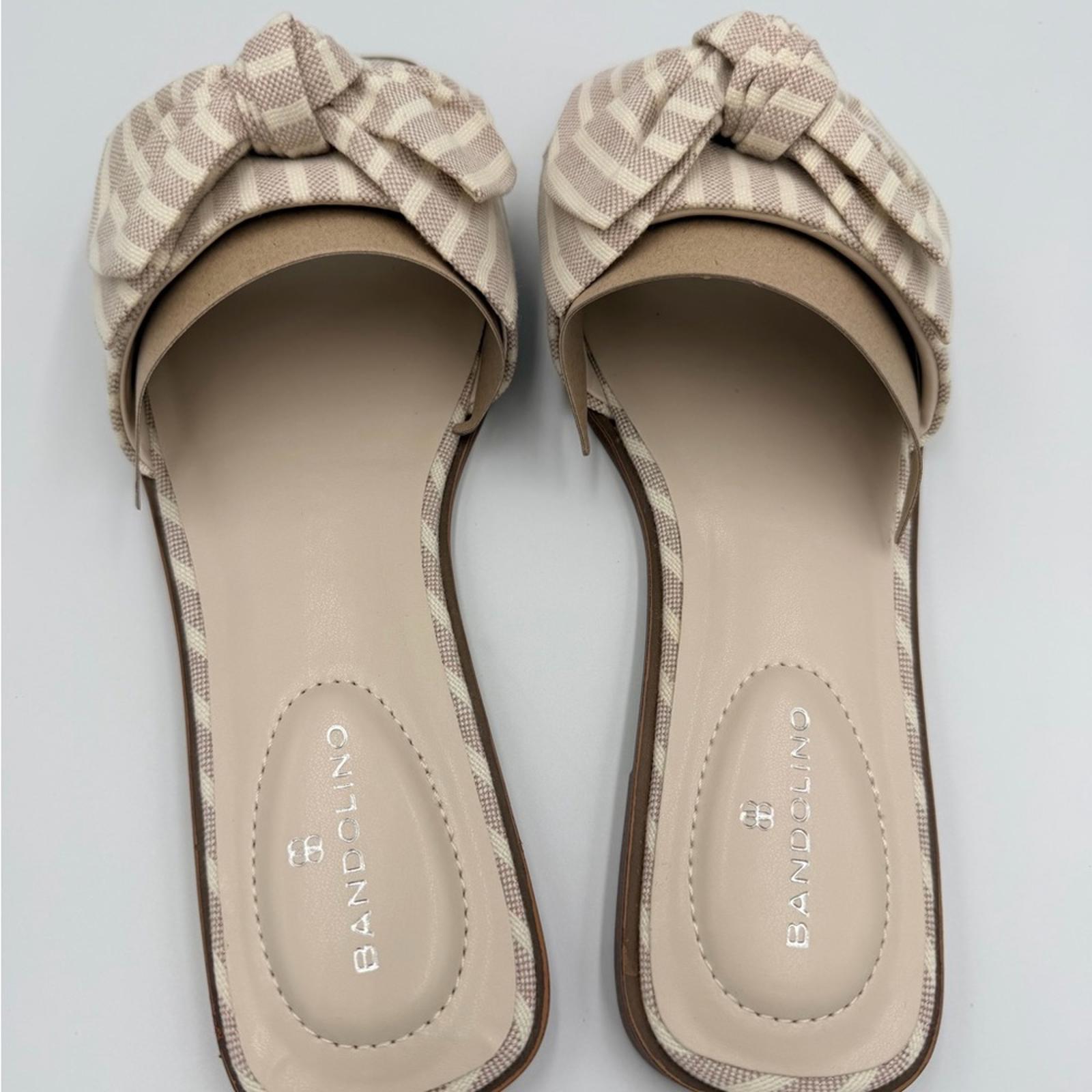 Elegant Bandolino sandals with beige stripes and a stylish bow. Ideal for casual wear.